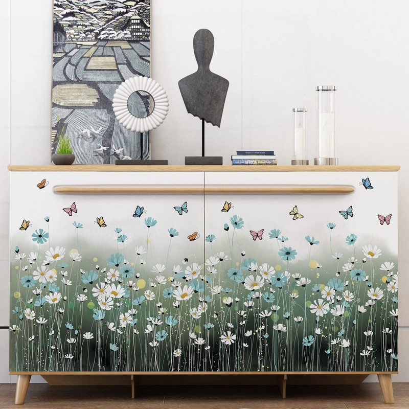 These white blue daisy flowers wall decals art murals are self-adhesive stickers with ready-made patterns that have been designed and made. The general material is PVC transparent film and imported backing paper is used, which is environmentally friendly and waterproof.It is quite easy to paste the stickers anywhere you want and remove them without any residue, thus you don't need to worry about damaging the wall.