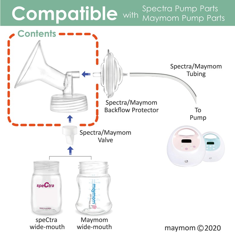 2. In addition to Spectra backflow protection, you can use the Maymom Long Handled Backflow Protector as well as the Short Stem Backflow Protector. You can also use the Maymom hose connector (sold separately) to connect this flange to many other common breast pumps on the market.