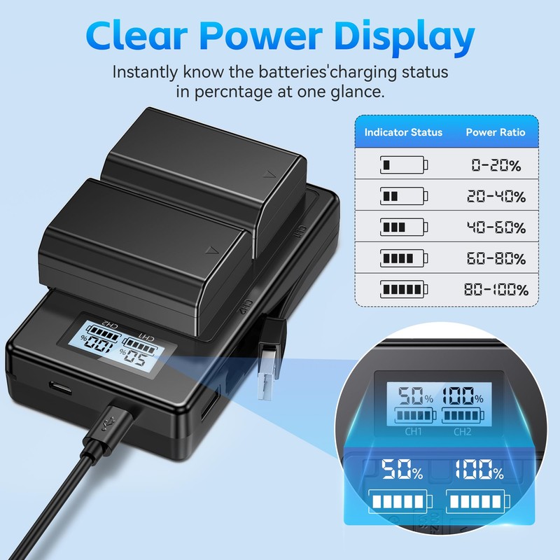 • 【Smart LCD Power Display】The sony a7iii battery charger features an LCD screen that displays precise charge status of the battery as a percentage, allowing you to quickly check the remaining power. The compact and lightweight design makes it easy to carry, perfect for traveling or outdoor use. Capture every beautiful scene with your camera