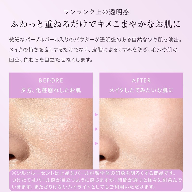 【パープルパール&シルクでトーンアップ効果】パープルパールと天然シルクによるメイクアップ効果で、どのような肌色も明るく透明感のあるつややかなお肌に仕上げます。毛穴やキメなど肌の凹凸、色むらも目立たせません。