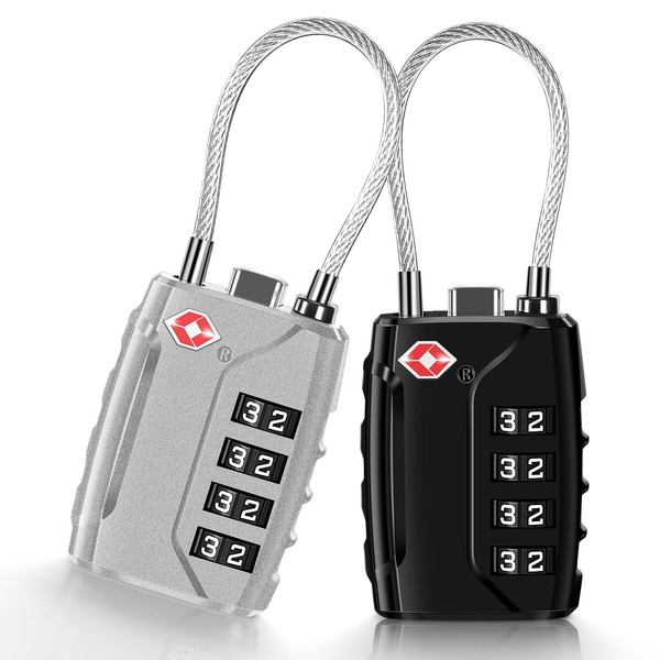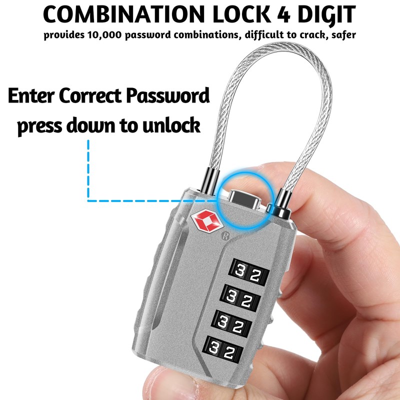 - Fixed luggage lock: you will receive 2 pieces TSA lock, one black and one silver. The body of the 4-digit combination lock padlock is made of high-strength zinc alloy, the body is thickened, the hardness is good, collision and drop-proof, not easy to damage; the wire rope is flexible and strong, has a diameter of 3 mm and can be guided through most zip holes for easy use.