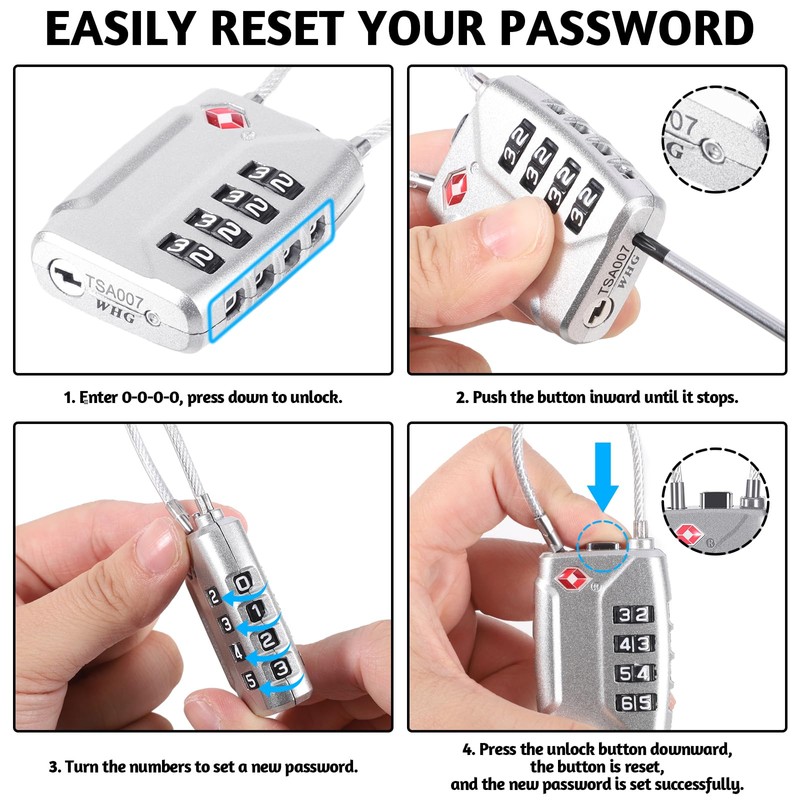 - Reset password: TSA luggage locks are easy to change the password. Enter 0-0-0-0 and press down to unlock. Press the button inwards until it stops. Turn the numbers and set a new password. Press the unlock button down, the button will be reset and the new password has been successfully set.