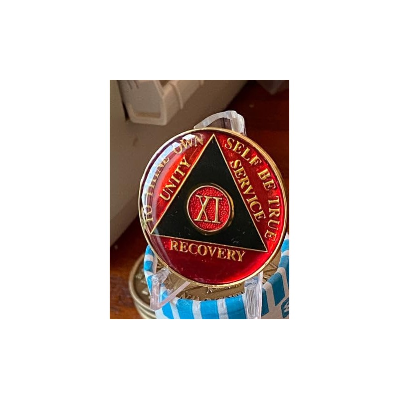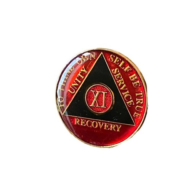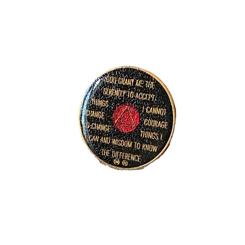 - 2 Year AA Medallion Red Black Tri-Plate Sobriety Chip. Glass Like Epoxy Dome with Serenity Prayer on back. 34x3mm Size