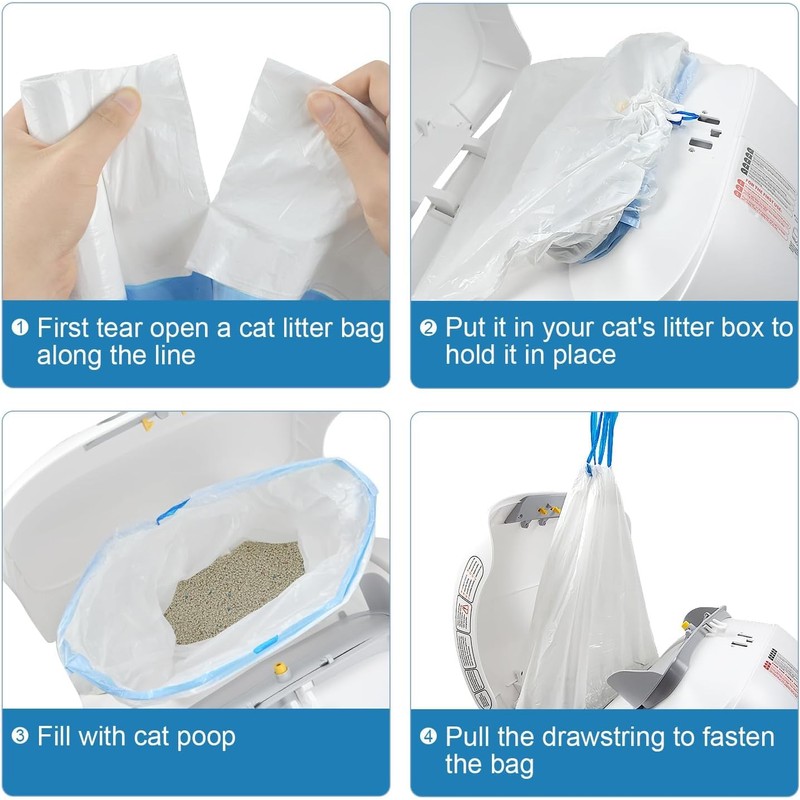 - Hassle-Free Cleanup: The liners have a convenient drawstring design that makes them simple to remove and replace. When it’s time to change the litter, just lift the litter bag ties, close it, and throw it away. Without cat litter leaked, no more messes, and no odor, saving you time and effort