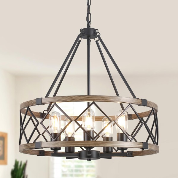 20'' Farmhouse Chandeliers for Dining Room, 5-Light Metal Wood Texture Kitchen Island Lighting, Rustic Drum Chandelier Hanging Light Fixture for Foyer Bedroom Living Room Entryway