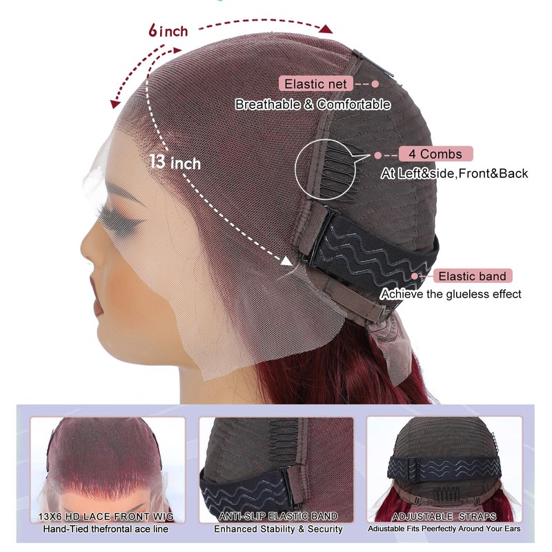 - 【99j Burgundy Lace Front Wigs Human Hair Material】 99J Burgundy 13x6 HD Human Hair Wigs Raw Materials Donated By Young Girls, Made of 100% Brazilian Virgin Human Hair, Healthy and Soft, Handmade by Our Wig Technicians, Professionally Carried Out Color Mixing, with Small Color Error, Durable and Non-Decolorizing, Natural and Harmonious, Just Like Your Own Hair, We believe You Will Love It.
