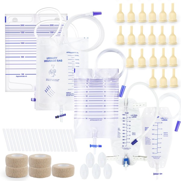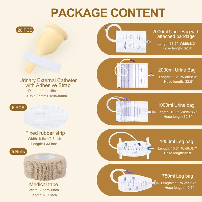 20 Latex Catheters(40mm) + 5 Self-Adhesive Wraps + 5 Stabilization Devices + 2×2000ml Urine Bags + 1×1000ml Urine Bag + 1×1000ml Leg Bag + 1×750ml Leg Bag