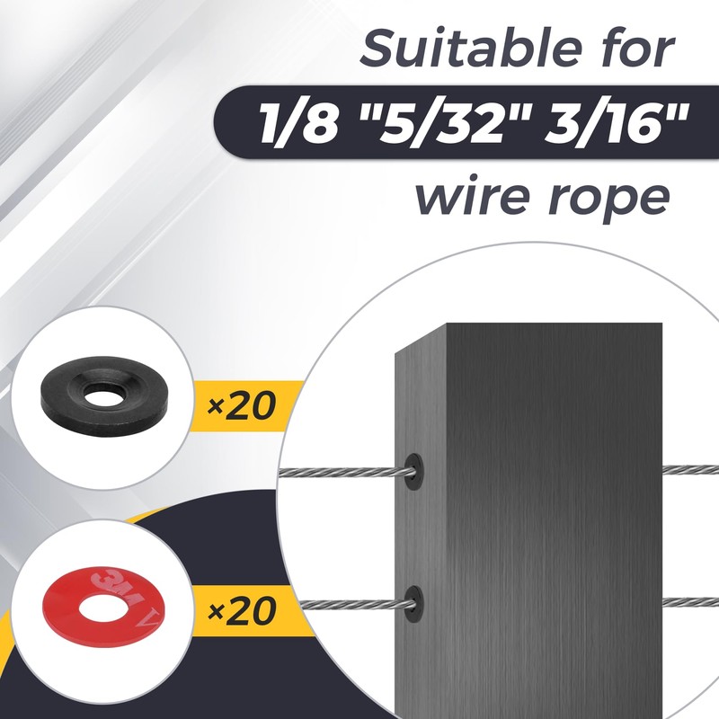 20 Pack 1/8" 5/32" 3/16" Black Cable Railing Kit Adhesive Grommet for 1/8" 5/32" 3/16" Wire Rope, T316 Stainless Steel Cable Railing Hardware Hidden Rope Holes for Wood or Metal Posts of Deck Stairs