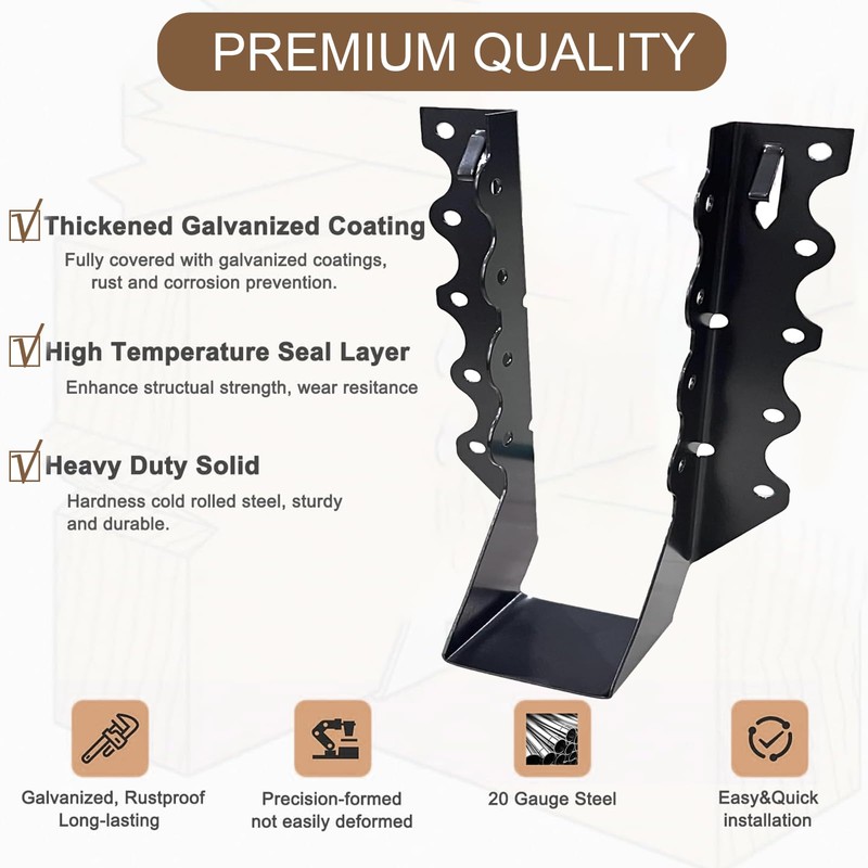 The joist hangers are made of carbon steel with high load-bearing capacity while having toughness and black powder coating on the surface to prevent rust and corrosion.