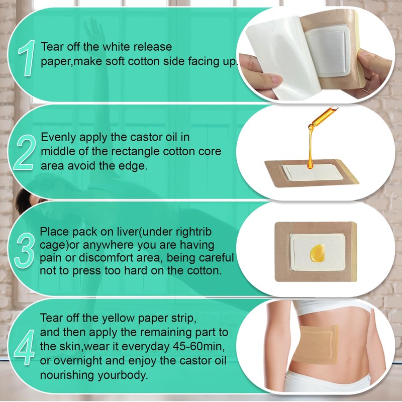 - Easy to Use: Our castor oil wraps are very easy to use, you just need to remove the white backing paper and apply a few spoons of oil. Wrap the castor oil on the Abdominal or liver, press gently, and cover it with a heat source for 1 hour until absorbed.