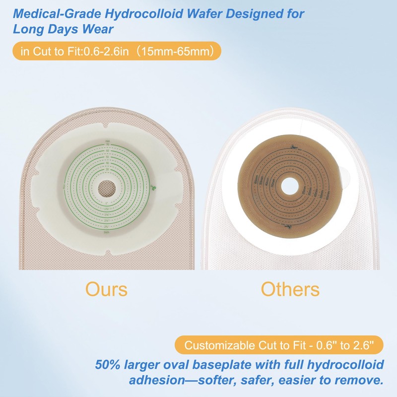 - Reliable, Long-Lasting Ostomy Bags: These colostomy bags are designed with clinical-grade hydrocolloids, featuring an oval-shaped hydrocolloid baseplate with six serrated notches. These notches are strategically placed to prevent the baseplate from lifting or deforming at the edges.