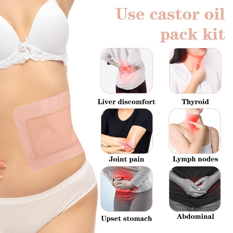 - 【Medium Size】This product contains 20 castor oil patches disposable, each measuring 20x14 cm or 7.87x5.51 inches (15x9 cm or 5.91x3.54 inches in inner diameter), caster oil patch is suitable for the abdomen, stomach, liver and other parts, and can also be used on the chest, breasts, arms, thighs, neck, knees, feet, navel, etc.