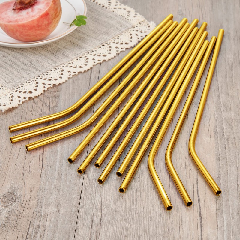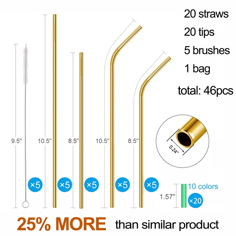 - VALUE SET,PREMIUM MATERIAL: Our gold reusable straws set includes 20 metal straws, 20 silicone tips, 5 straw cleaning brushes and 1 travel case. These gold drinking straws are made of GENUINE premium 18/8 stainless steel. With our technique, our metal straws have more beautiful color, cool looking and very smooth for your lips and hands to touch.