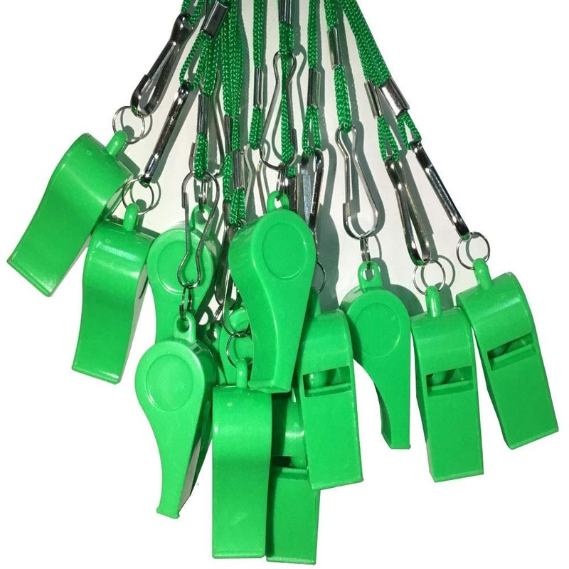 - Package includes: 20 Pcs Green Plastic whistles with lanyard