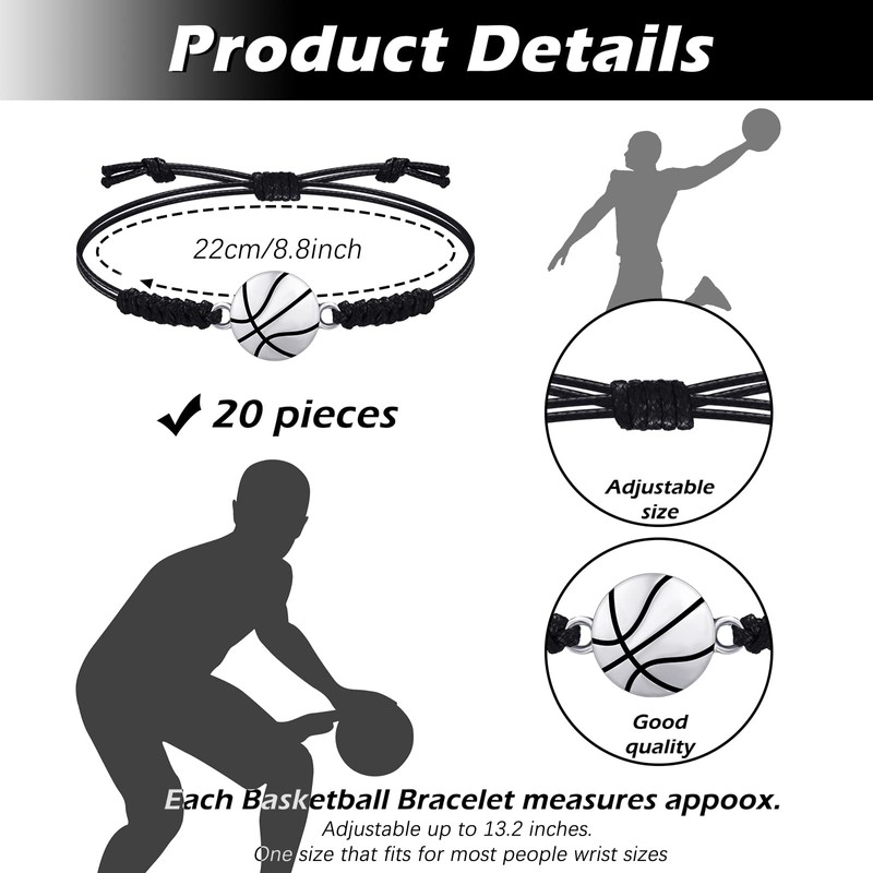 20 Pieces Basketball Bracelets Basketball Charm Rope Bracelet Players Basketball Jewelry Adjustable for Girls Women Men Teens (Basketball Style with Black Rope)