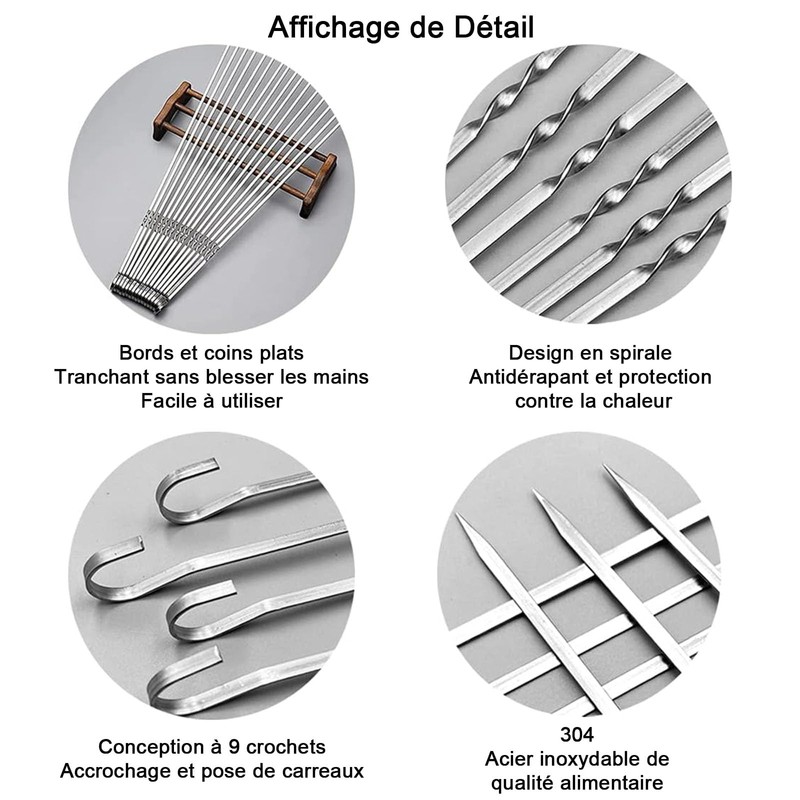 - 2. Stainless steel kebab skewers can be easily used for skewers, making it convenient for you to grill. Material Made of food grade 430 stainless steel, which can be used at high and low temperatures. They are durable and reusable.