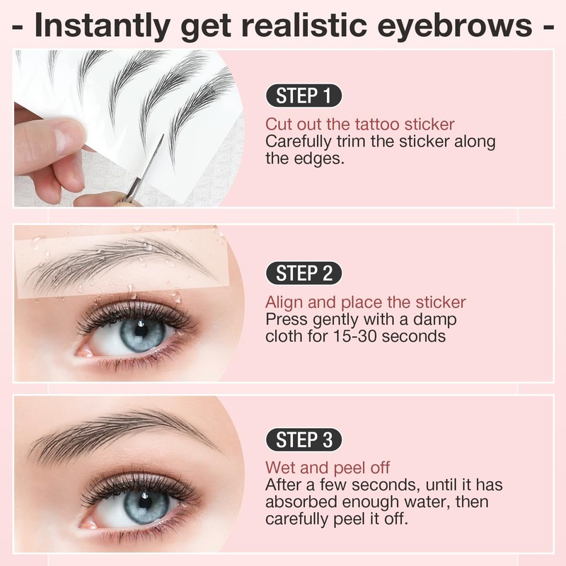 - QUICK & EASY APPLICATION-Simplify your beauty routine with these easy-to-use eyebrow tattoos stickers! Apply in seconds using just water, and enjoy perfectly shaped brows without the need for makeup skills. A detailed instruction guide ensures that anyone can achieve a beatiful eyebrows look at home