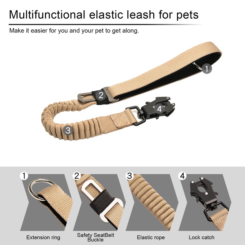 20” Strong Short Leash for Dog, Heavy Duty Bungee Dogs Leash with Padded Handle Car Seatbelt, Dog Training Leashs for Large or Medium Dogs - Can be Used with Other leashes (Khaki)