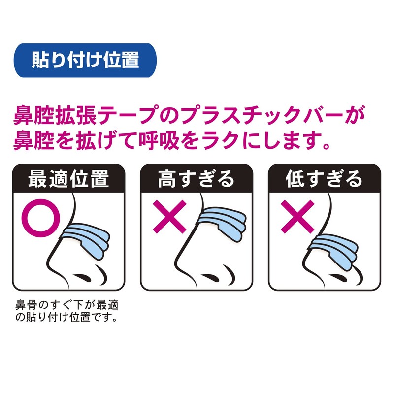 - 【ご使用方法】・ご使用前に鼻(貼る部分)をよくふき取り、汚れ・皮脂・化粧などを取り除いてください。・鼻腔拡張テープ裏面の紙を中央切れ目よりはがします。・鼻腔拡張テープの中央が鼻の中心になるよう位置を注意して貼り、鼻の中央から両側に向かって押さえてください。・運動など、発汗する時に使用する場合は、運動する1時間程前に貼ってください。・はがす際は無理にはがさず、ぬるま湯で十分に濡らしてからゆっくりとはがしてください。