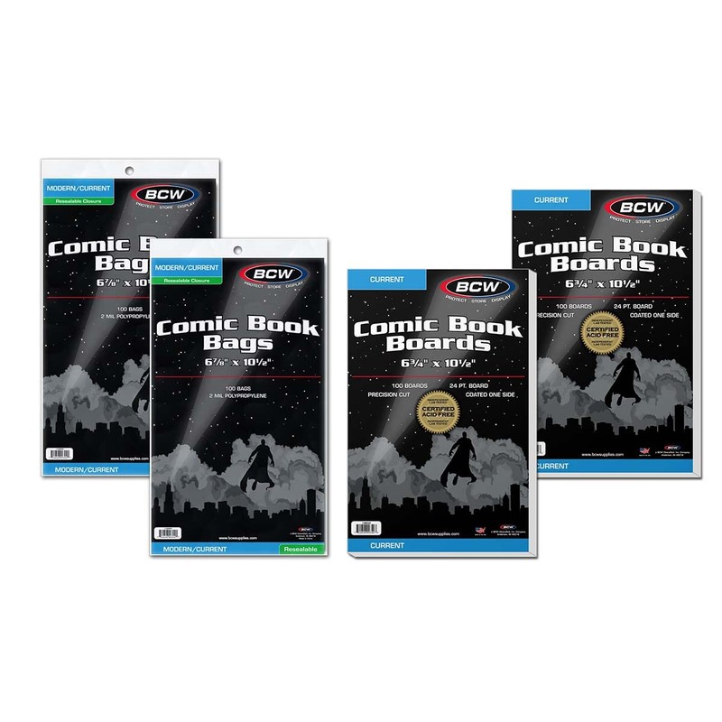 2 Packs of 100 BCW Standard Resealable Current Comic Bags + 2 Packs of BCW 100 Current Comic Boards with this deal. These are the standard version bags that accommodate standard thickness current comic books