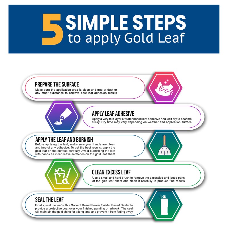 - Applications: Gold leaf sheets for art are widely used for DIY and craft, gilded paintings, nail art, statue decoration, furniture, and interior design projects. To get the best crafting results, one needs to have a good amount of practice to uplift the artwork or patience and willingness to learn the techniques to master the art