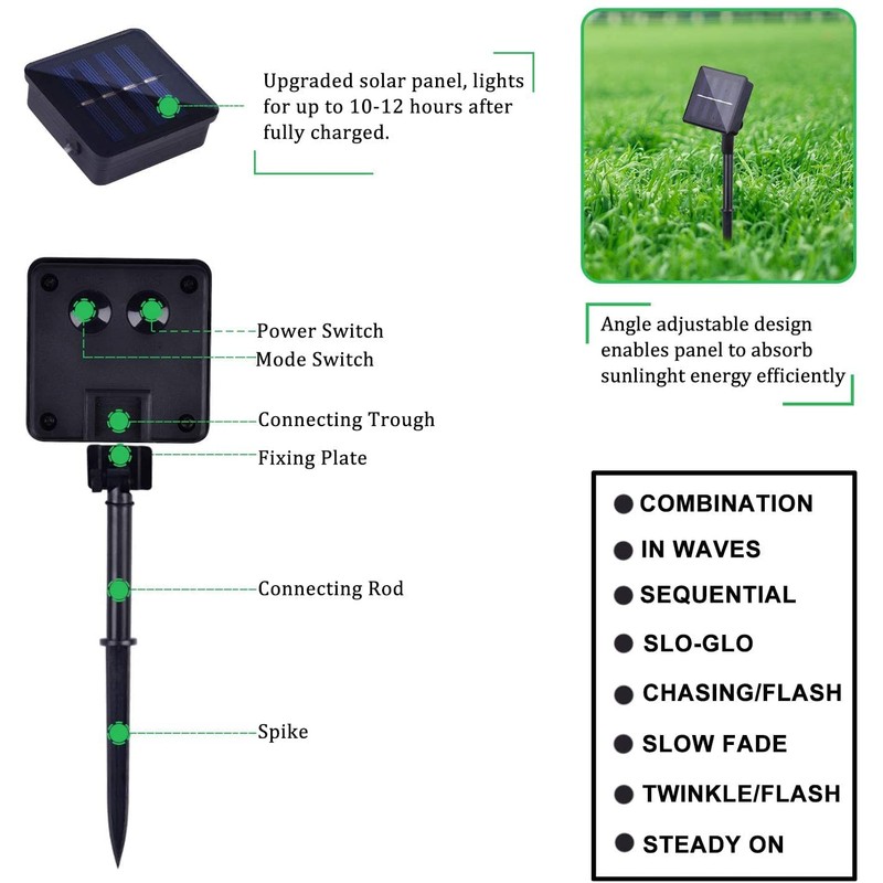 8 Light Modes: The control buttons at the back of the solar panel allow you to change modes easily among fireflies flashing, waving, fading, chasing/flashing, slowly fading, twinkling/flashing, steady on.