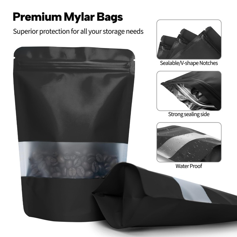 200 Pack Food Storage Bags, Foil Pouch Resealable Bags with Matte Window, Stand Up Sealable Bags for Packaging, 5.4"×7.8" Black