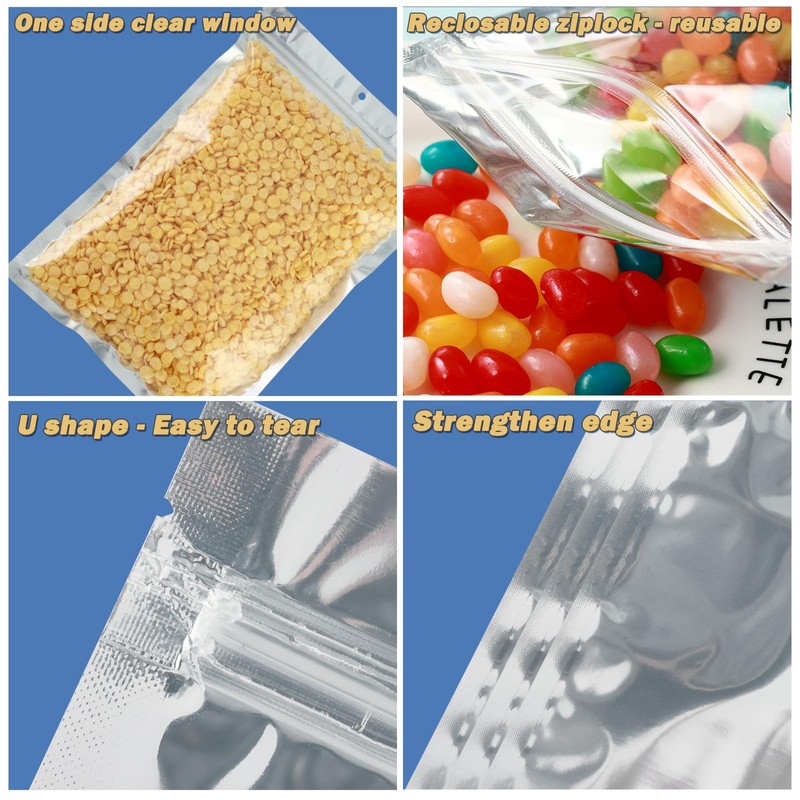 - Sturdy Materials: These 4.7 x 8 inches mylar food storage bags are made from premium food-safe plastic, aluminum foil for one side, and crystal clear for another side. Very convenient and easy to tell apart the items inside the edible packaging bags.