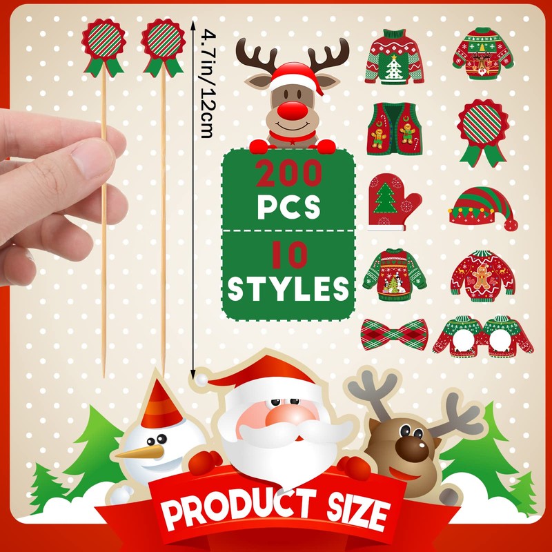 200 Pieces Christmas Cocktail Picks Ugly Sweater Cupcake Toppers Medals Glasses Gloves Hats Bows Appetizer Toothpicks Christmas Food Picks Bamboo Skewers for Holiday Drink Fruit Dessert, 4.7 Inches