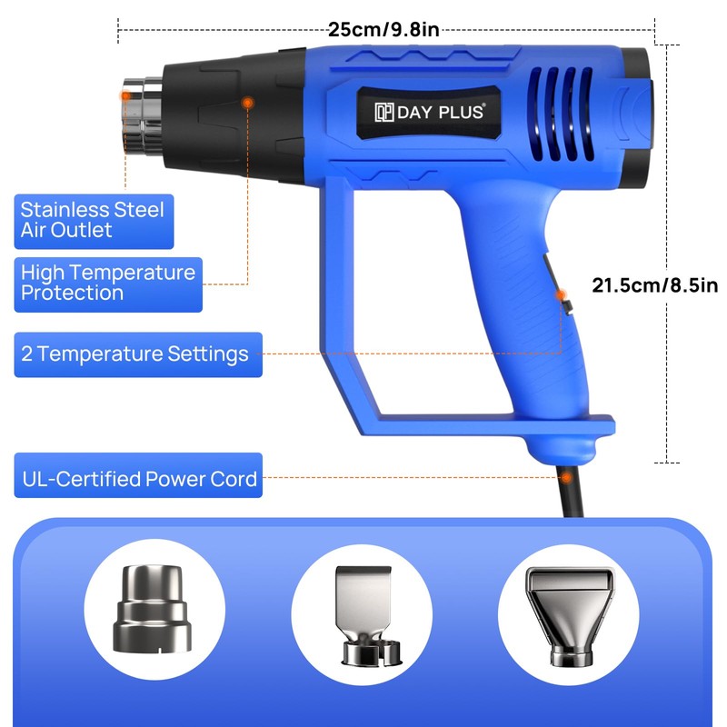 • ♛2000W Heat Gun: This hot air gun features fast heating and fast heat dissipation. With input power of 2000W and stronger motor, the heat gun can ensure continuous and steady airflow, perfect for home improvement and DIY projects.