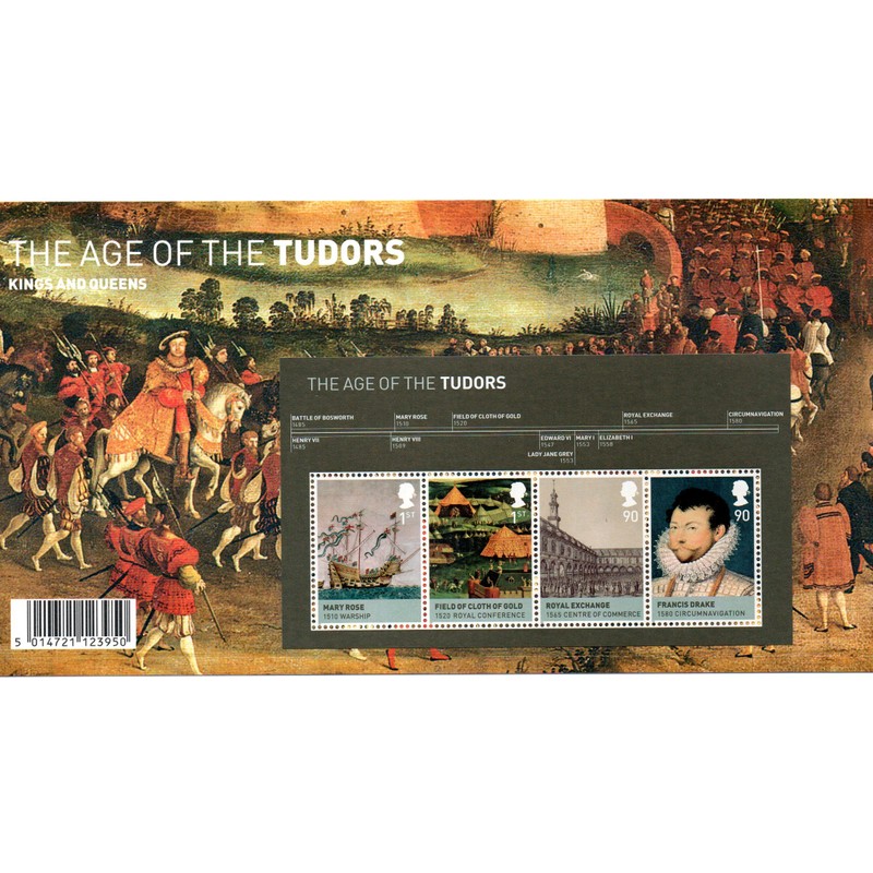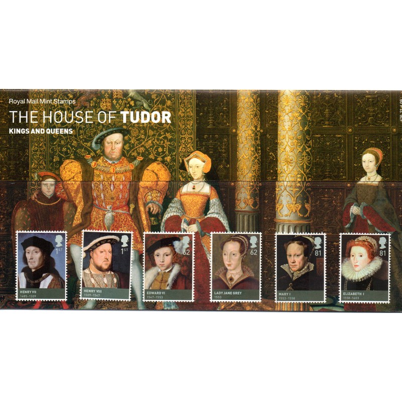 - This pack looks at the turbulent reign of the six Tudor monarchs, encompassing religious change, creation of the first theatres and growth of a dominant naval power. Note: An additional minisheet of stamps is included in the back of the pack.