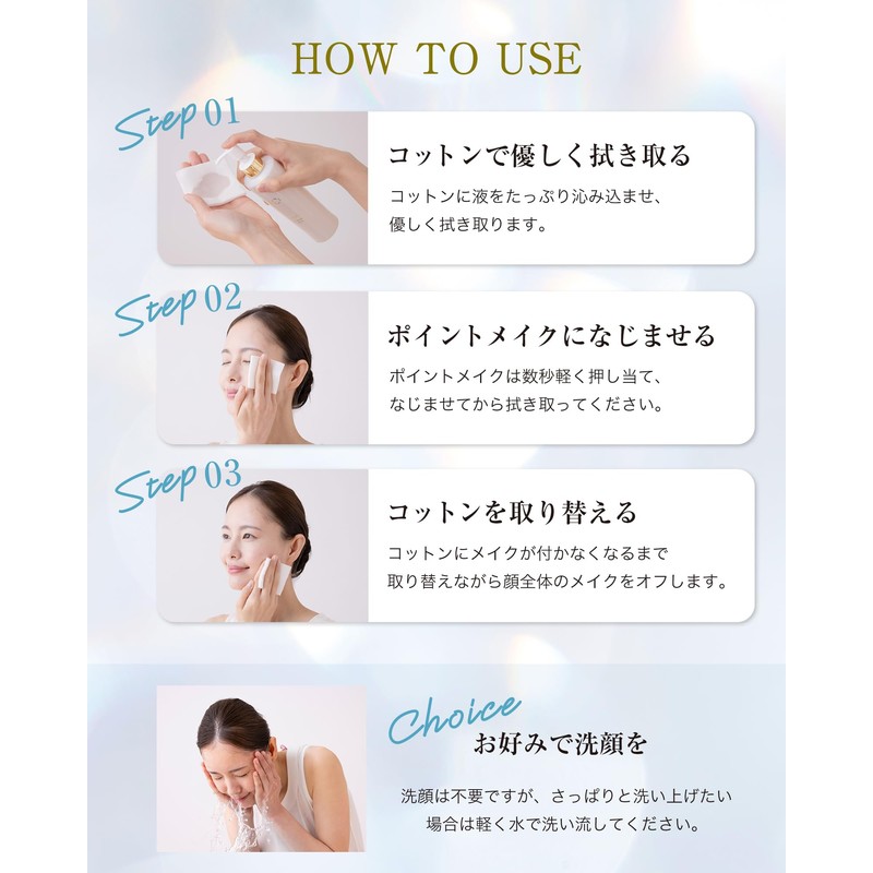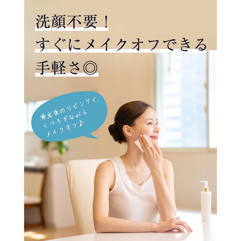 - 【洗顔不要!すぐにメイクオフできる手軽さ◎】 メイク時間が長い程お肌の負担は大きく、肌老化が進んでしまいます。 拭き取り式のクレンジングウォーターは洗顔不要で、帰宅後のリビングでもくつろぎながらすぐにメイクを落とせます。