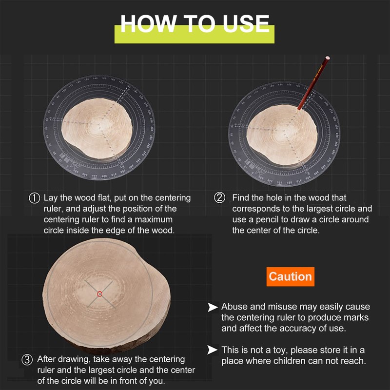 - HOW TO USE: Lay the wood flat, put on the centering ruler, and adjust the position of the centering ruler to find a maximum circle inside the edge of the wood. Find the hole in the wood that corresponds to the largest circle and use a pencil to draw a circle around the center of the circle. After drawing, take away the centering ruler and the largest circle and the center of the circle will be in front of you.