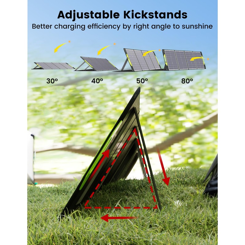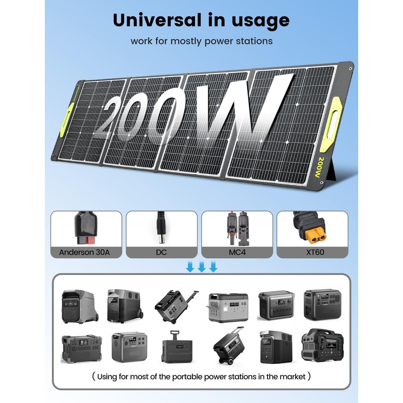 • [Adjustable and Versatile] The 200W portable solar panel features a 30-50° adjustable angle bracket and an integrated solar angle guide to maintain a 90° angle with the sun, maximizing energy capture.