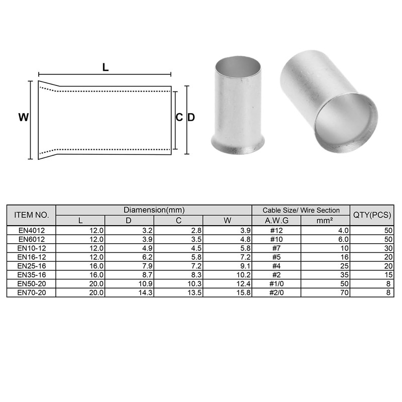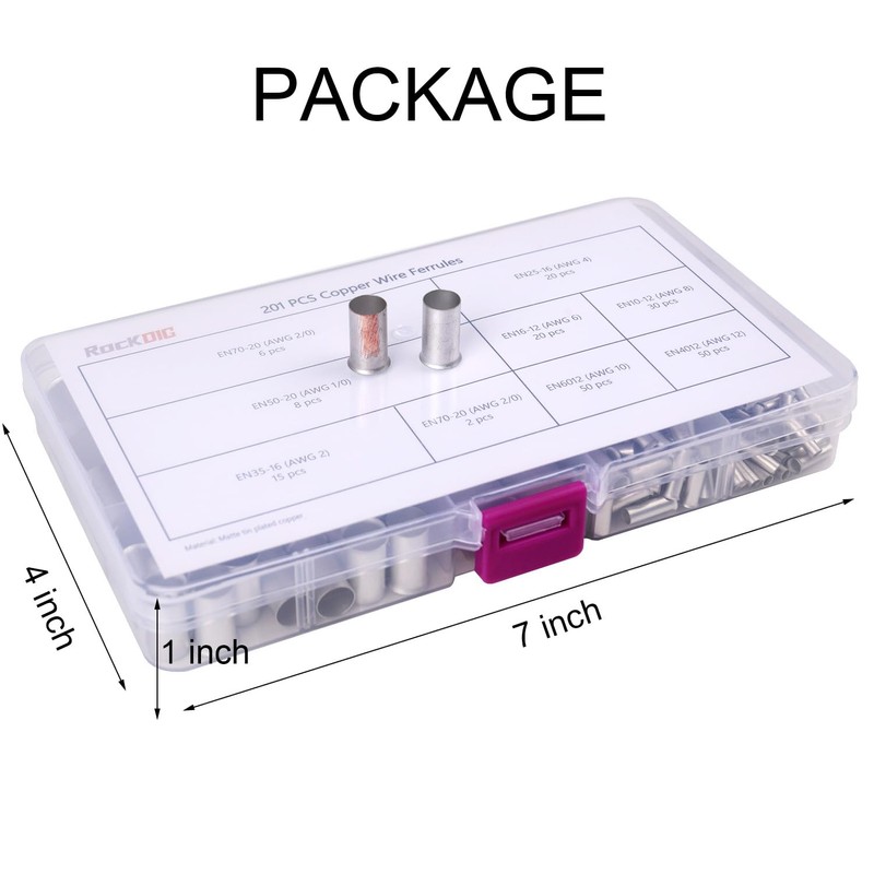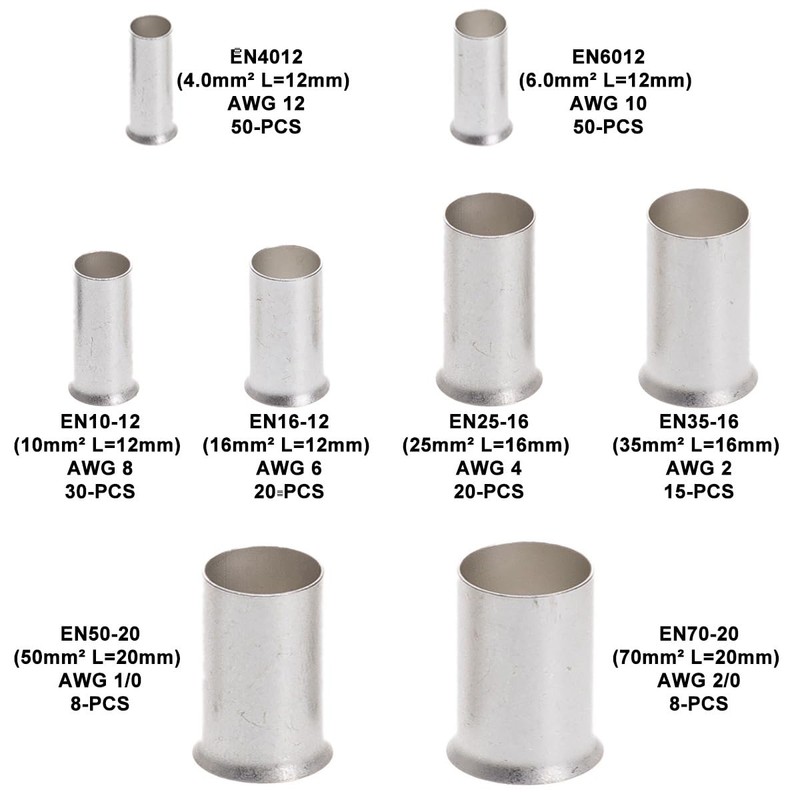 - PACKAGE INCLUDES: Gauge 12(50pcs), Gauge 10(50pcs), Gauge 8(30pcs), Gauge 6(20pcs), Gauge 4(20pcs), Gauge 2(15pcs), Gauge 1/0(8pcs), Gauge 2/0(8pcs), total 201pcs wire ferrules