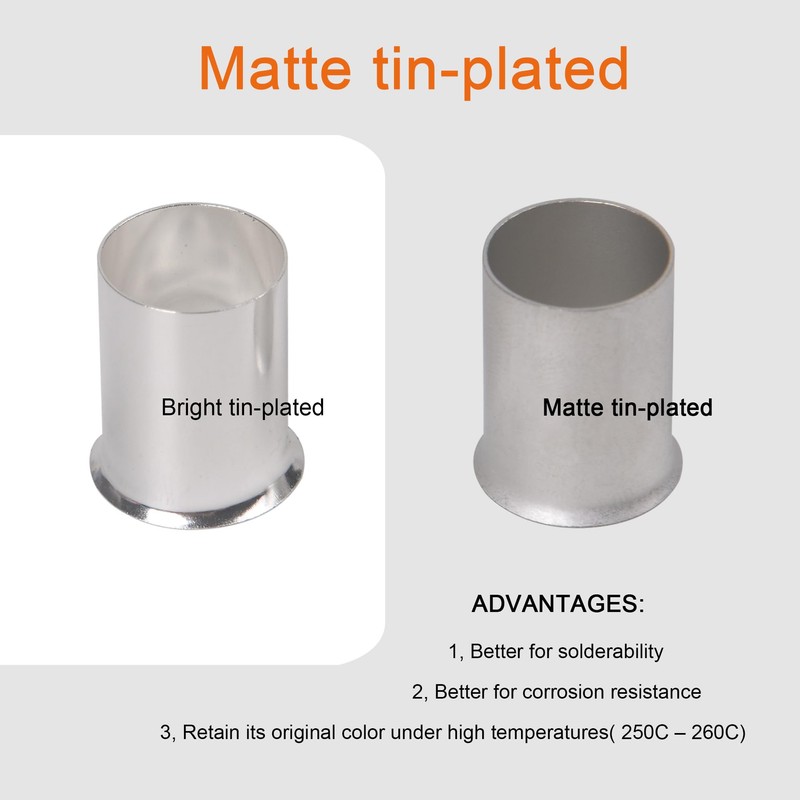 - FINISH: The copper wire ferrules are finished by Matte Tin Plating which is better for solderability, corrosion resistance, will also retain its original color under high temperatures, compared with Bright Tin Plating