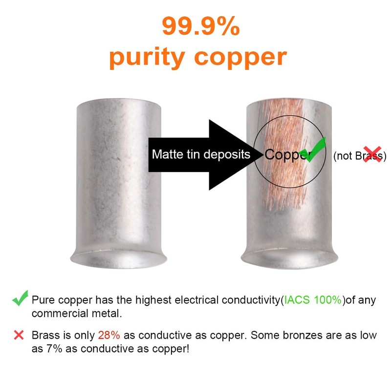 - MATERIAL: The copper wire ferrules are made of 99.9% purity T2 red copper rather than brass. Pure copper has the highest electrical conductivity(IACS 100%) of any commercial metal. Brass is only 28% as conductive as copper. Some bronzes are as low as 7% as conductive as copper