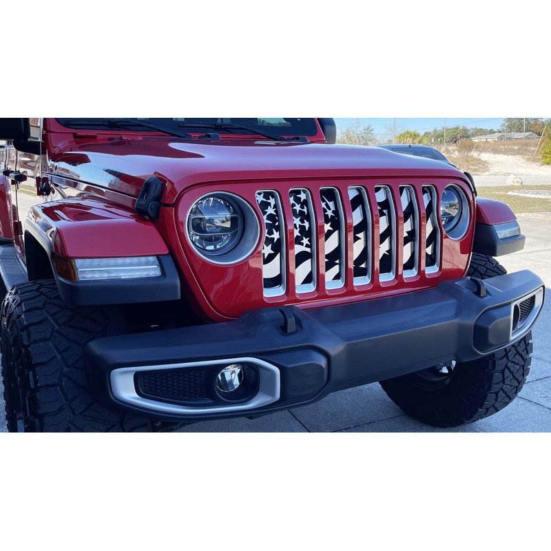 - This rugged stainless steel Jeep Grille insert features a patriotic Star Spangle style with a durable satin finish. Our jeep grill inserts fits all 2007-2018 Jeep Wrangler JL and 2018-2023 Gladiator vehicles.