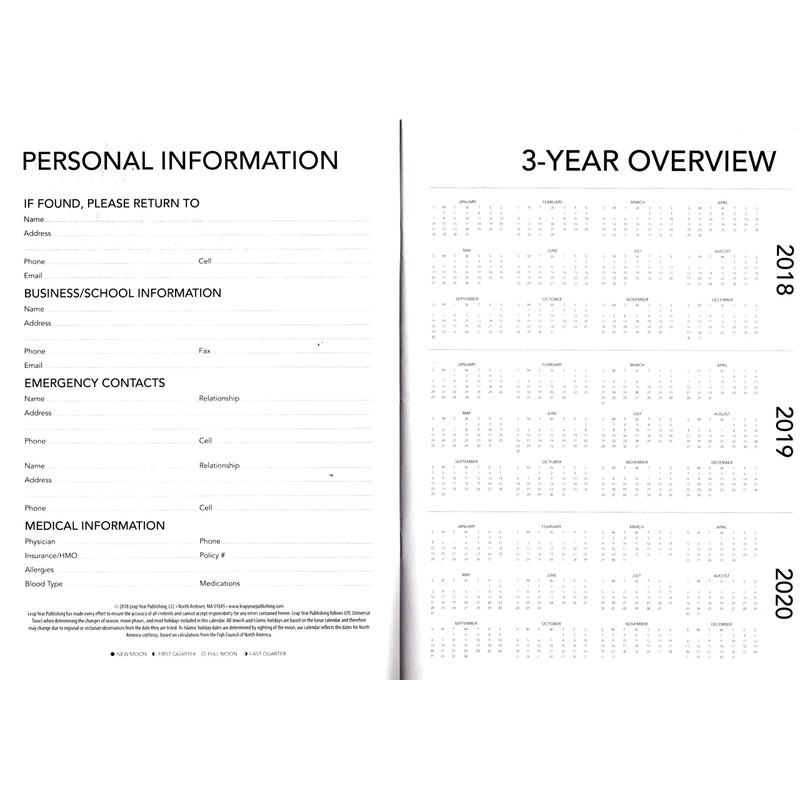 - Features a monthly page format, Personal Information - 3 Year reference calendar - 2018 Planning - 2019 Planing - Notes