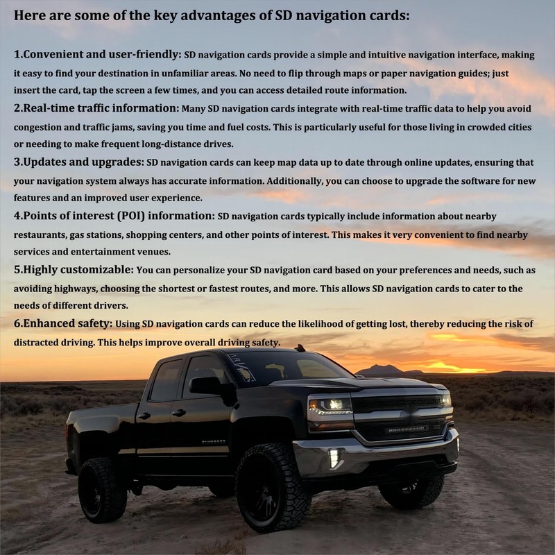 • Comprehensive Map Coverage: The Navigation SD Card offers comprehensive map coverage, including roads, streets, highways, and traffic signage information. No matter which area you're driving in, you can rely on this SD card's up-to-date map data to navigate effortlessly, avoiding getting lost and unnecessary hassle.