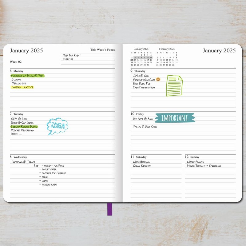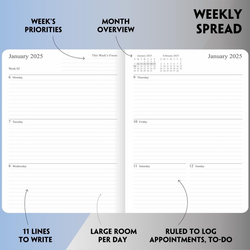 - Weekly view pages feature Mon-Sun format, each day has plenty of space for your appointments, reminds and to-do lists; A Week’s Focus section on the top of the left page and on the right page is a calendar section compose of current & future month