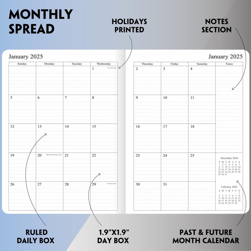 - Monthly spread pages with large ruled daily boxes, a notes section on the side for notes or monthly goals, previous and next month reference calendars for easy planning