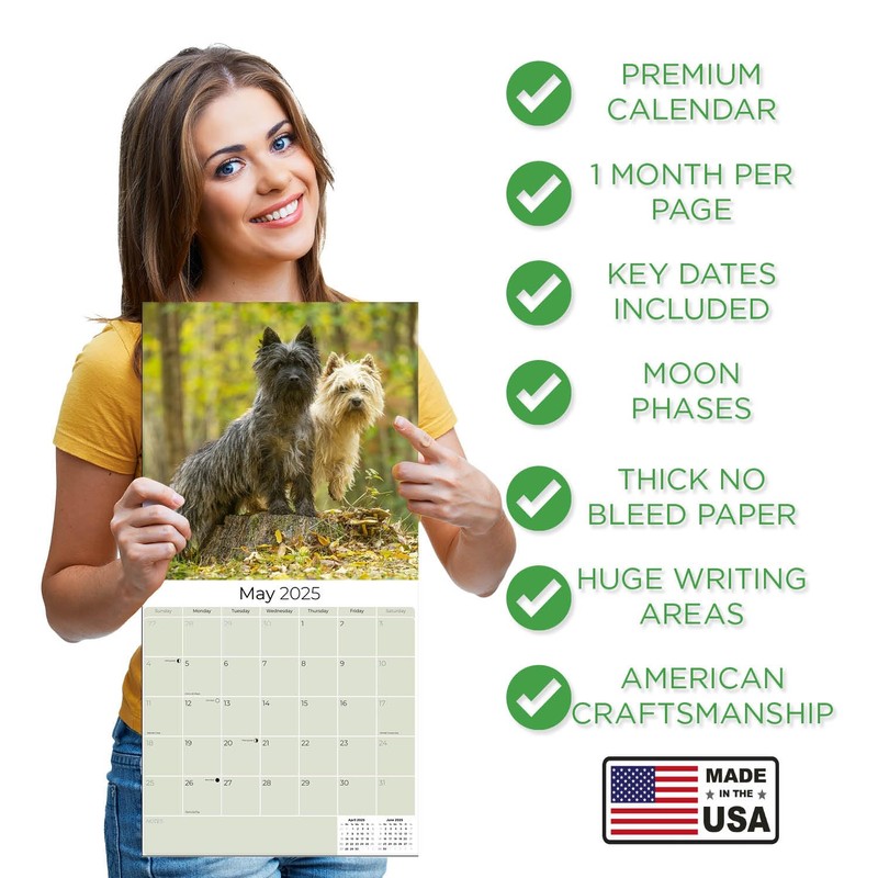 - PREMIUM PAPER - Each of our small batch Cairn Terrier calendars runs uses the thickest paper in their class. Our artisans produce these premium BONUS month 2025 Cairn Terrier calendars with high-definition Cairn Terrier images and print them right here in the U.S.A. using the highest quality inks and environmentally friendly American paper from responsible sources.