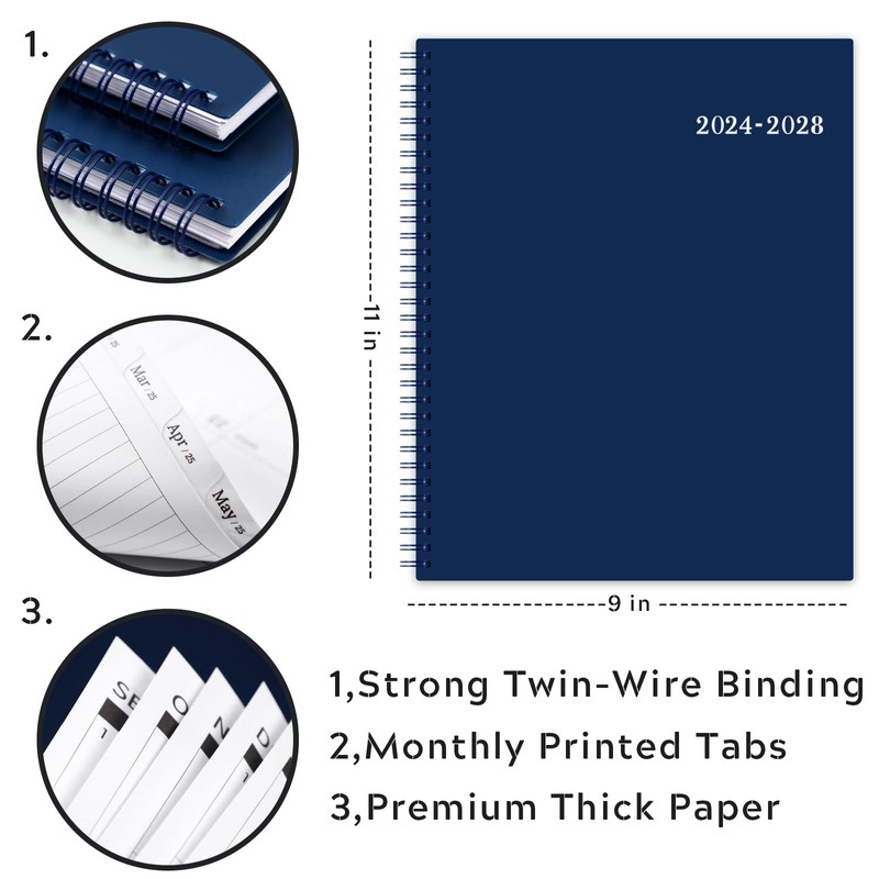 - đź“… PROFESSIONAL DESIGN - Sturdy metal twin-wire binding allows for 360 degree folding over. Flexible durable cover to protect inner pages of this 2024-2028 monthly planner. Coated monthly tabs and back double-sided pocket for storing your scattered items, such as cards.