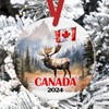 2024 Canada Christmas Ornament, Round Ceramic and Comes with Red Satin Ribbon, Features Moose Elk and Maple Leaf Canadian Flag