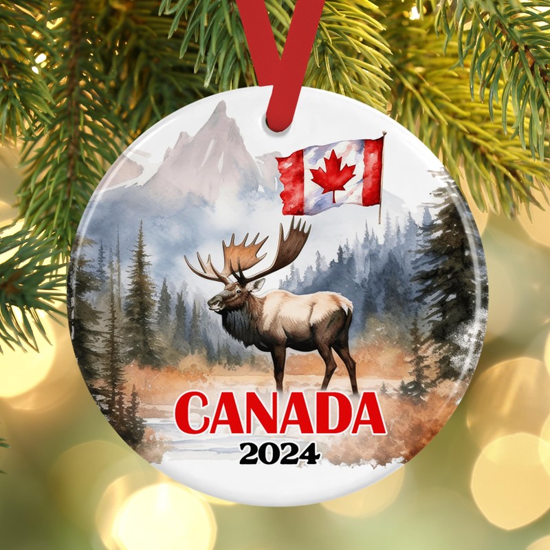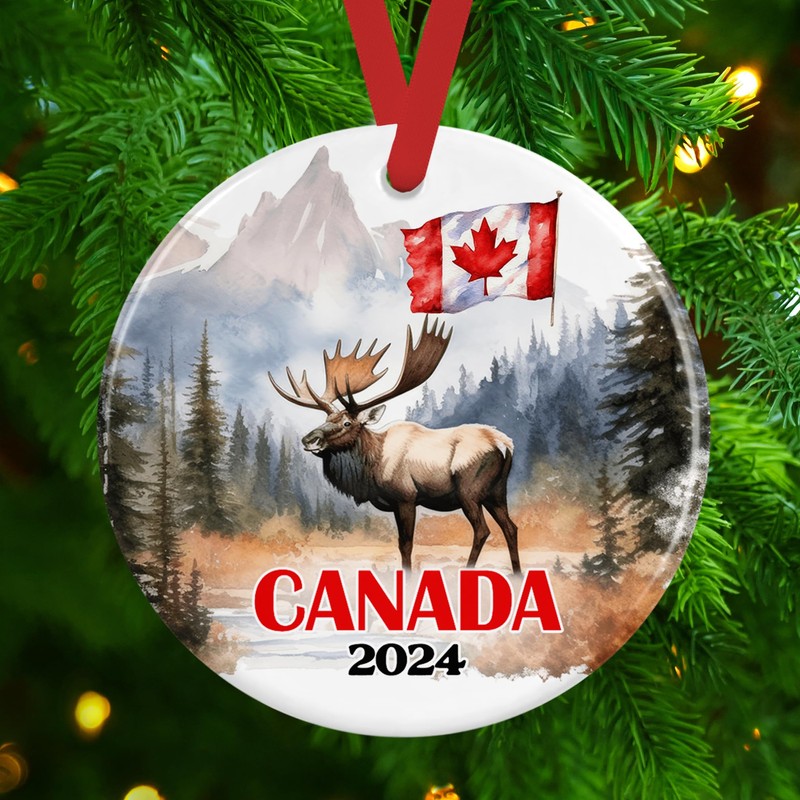- Commemorate the spirit of Canada with our exquisite Christmas ornament. Features the beloved Canadian Moose Elk and maple leaf flag.