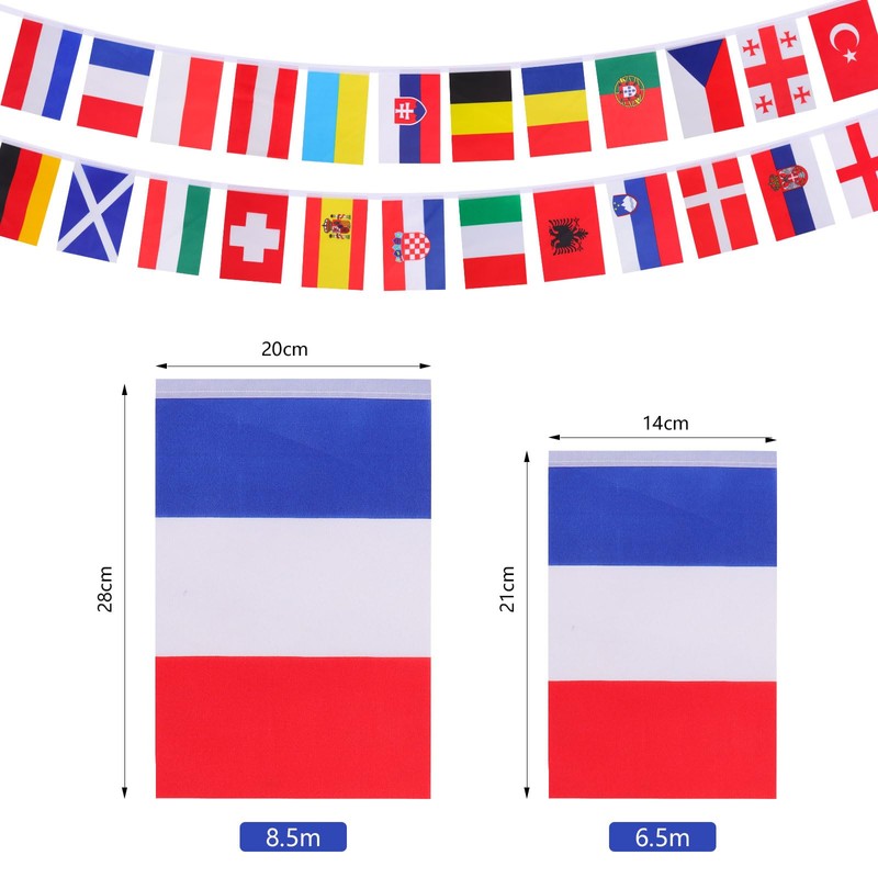 - [Specifications]: The flag chain consists of 24 different rectangular national flags, the size is 14*21cm/20*28cm, and the total length of the flag is 6.5m/8.5m. The length can be freely cut according to the needs of different occasions, enough for decoration.
