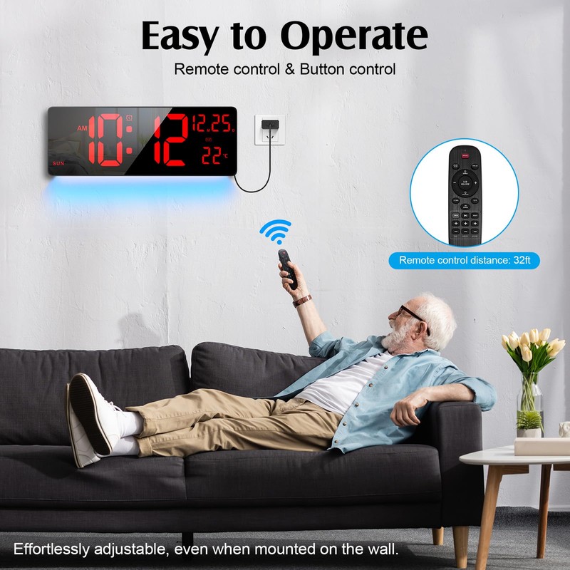 - 【RGB Dynamic Night Light】- This large digital wall clock has added three dynamic RGB night light modes in addition to the four fixed-color night light modes commonly found on the market. It combines simplicity with dynamic aesthetics perfectly. You can choose from five brightness levels or simply turn it off. It creates a comfortable ambiance, meeting your nighttime lighting needs without affecting your sleep.