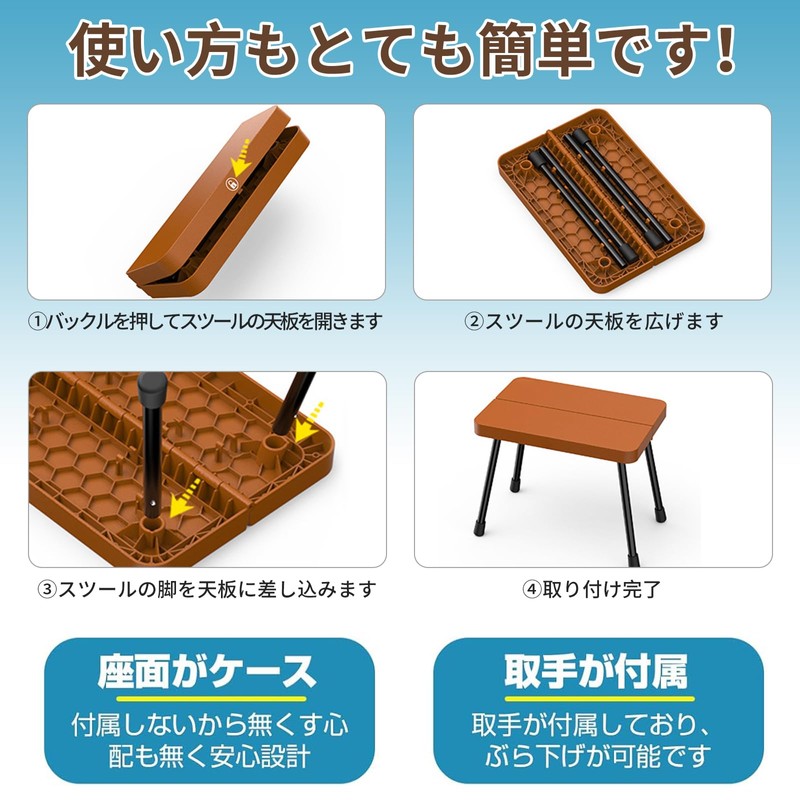 • 【組み立て簡単、持ち運び簡単】組み立て方法もとても簡単です。バックルを押してスツール面を開き、スツールの足をスツール面に差し込み、スツール面を広げるだけで設置完了です。折りたたんだ後は小さくなり、片手で簡単に持ち運べます。アウトドアや旅行に最適です!