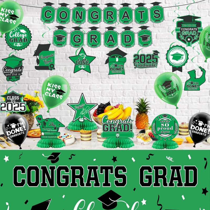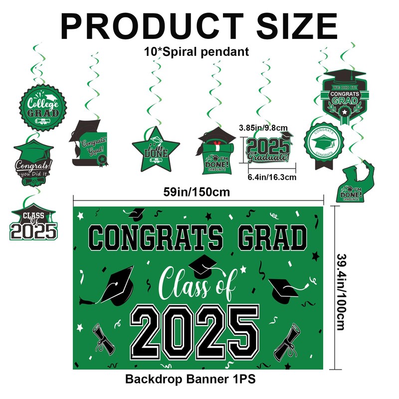 • 【2025 Graduation Decorations】You will receive 34 party decorations, including 1pcs "CONGRATS GRAD" banner, 1pcs class of 2025 Backdrop, 10pcs gradation handling swirl congrats grad, 4pcs Honeycomb Table Toppers and 18pcs balloons.